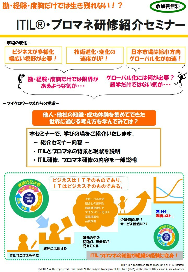 ITの問題はITで解決できるわけではありません。 解決方法は、成功事例の中にあります!! ITILというITシステムに関する成功事例集についてのご紹介セミナーです。